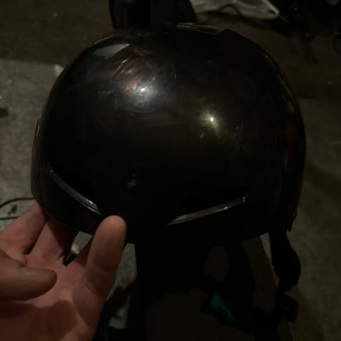 Smith hjelm med flere ventilasjonshull og justerbar stropp for bedre passform. Hjelmen har et ytre skall i beige farge og et indre polstret lag med kamuflasjemønster. Egnet for aktiviteter som krever hodebeskyttelse.