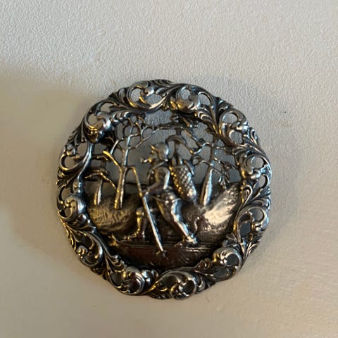 Veldig fin nål i tinn. 5 cm. Motiv : brudeferden i Hardanger.