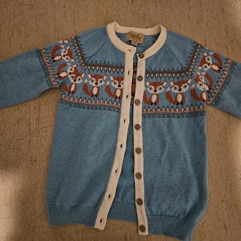 Pent brukt MeMini cardigan selges. Veldig god og myk med en blanding av 60 % ull, 20 % bomull og 20 % viskose.