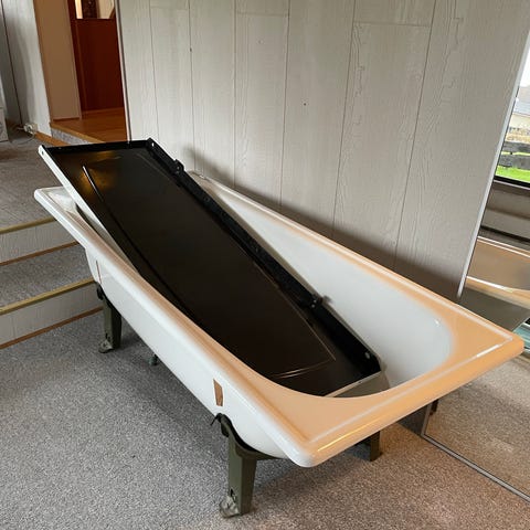 Badekar i hjørnemodell med lengde på 100x150 cm farge hvit. Front deksel trenger noe reparasjon for å sitte fast. Ellers er det i orden.