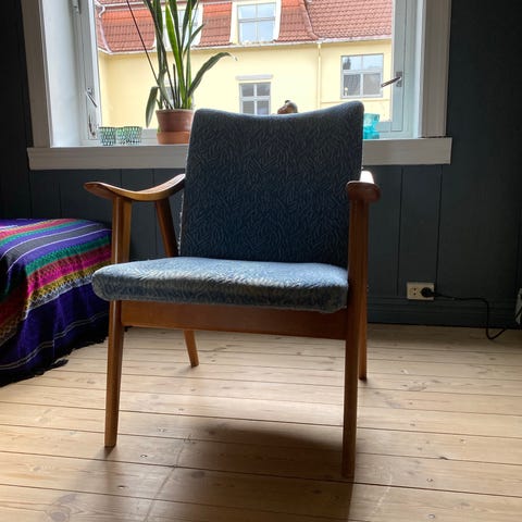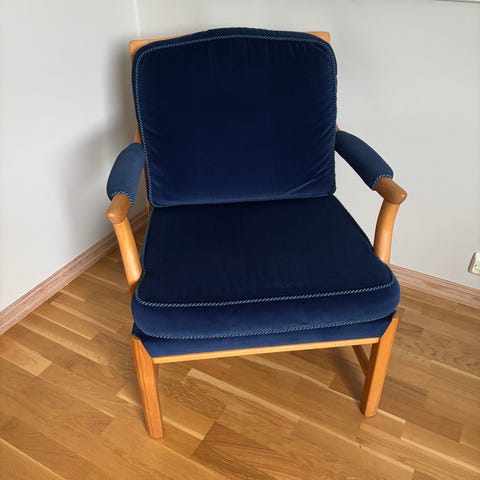 En solid og bred stol med et flott utseende. Frederik Kayser modell 806 for Vatne møbler. Stolen og putene er i god stand. Jeg tror denne varianten, med mørkere treverk, er i palisander, men er usikker. Jeg satte pris til 1500,- eller bud.