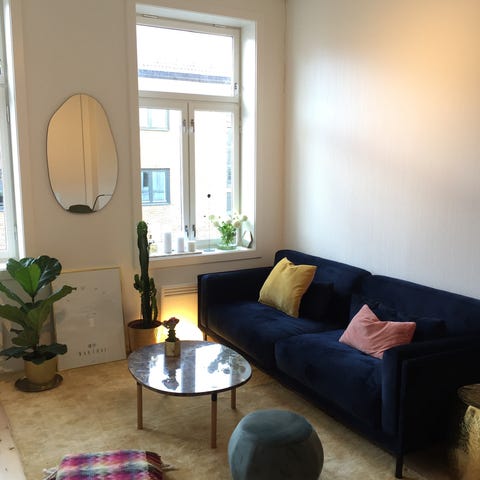 Pent brukt sofa i en gylden rød farge. Svært god å sitte i. Og å ligge i. Gi gjerne bud.
