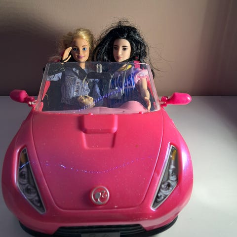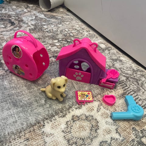 Barbie lekesett som inkluderer en rosa bil og en ambulanse med tilbehør, vaskestasjon og diverse pleieutstyr og en rytter Barbie.