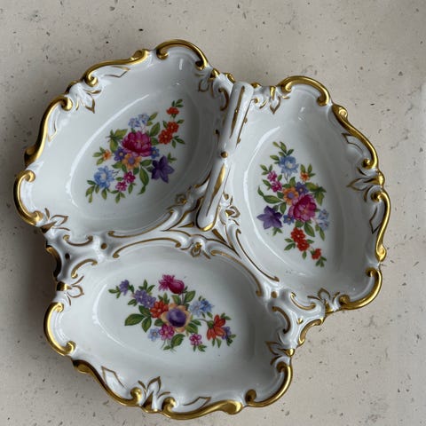 Nydelig porselensskål med blomstermotiv og gullkant. Ser ut som ny. Kan brukes til serveringsskål eller til pynt.