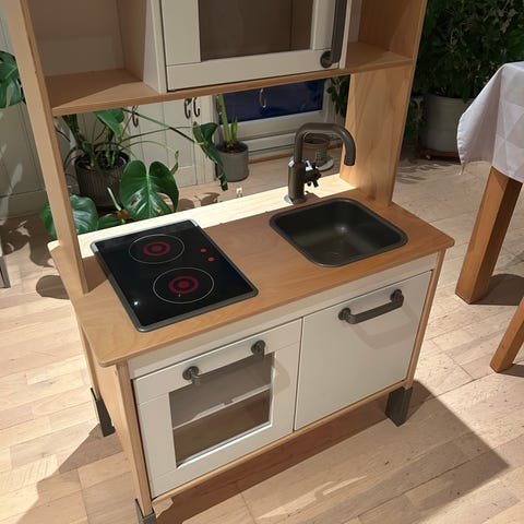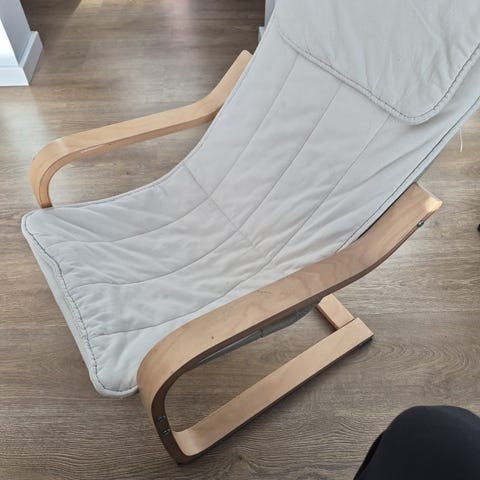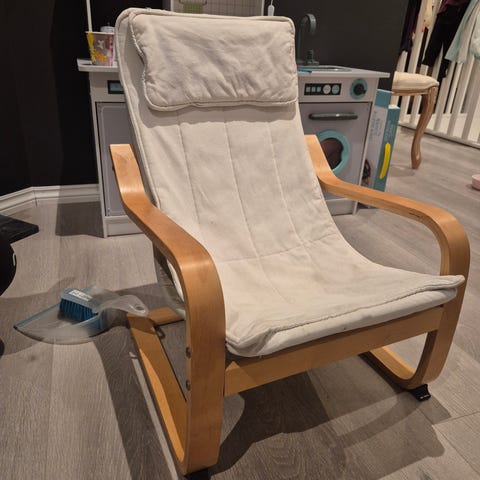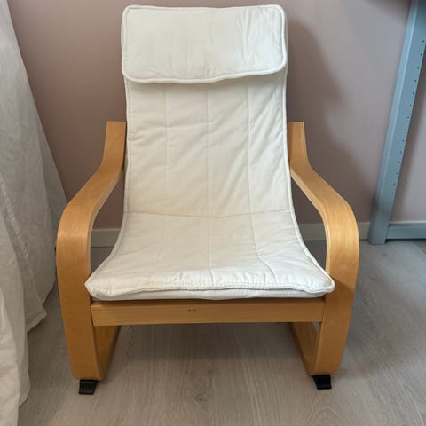 IKEA lenestol til barn med lys polstring og treramme. Stolen er designet for barn og har en komfortabel form som passer til mindre brukere.