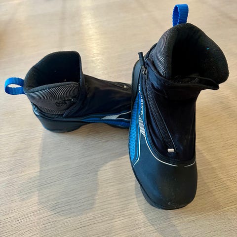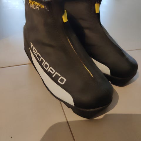 Tecnopro skisko i svart og hvit med blå glidelåsdetaljer. Passer til bruk i vintersport som langrenn . Skiskoene har en slitesterk yttersåle med godt grep for stabilitet på snø og is. Størrelse 38