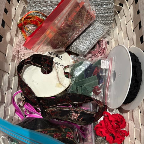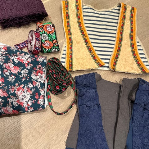 Stoffrester, bånd og klipte liv til festdrakt etc