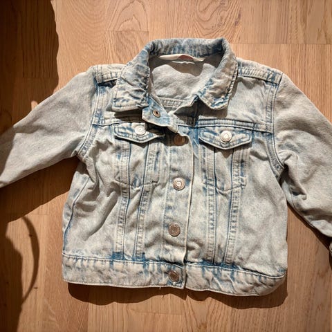 H&M denimjakke for barn i størrelse 104. Jakken er lys blå i fargen og designet for både gutter og jenter. Laget av denimmateriale, med knappelukking foran og klassisk krage.