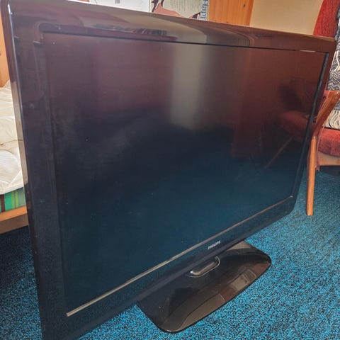 Samsung Plasma TV med fjernkontroll og tilkoblingskabler. TV-en har flere innganger for tilkobling av eksterne enheter. 50 tommer