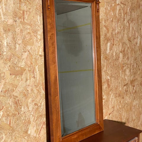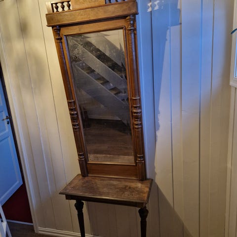 Ovalt veggspeil med en dekorativ ramme. Rammen har rundt hele kanten detaljerte utskjæringer med et klassisk design. Speilet antas å være over 100 år gammelt.