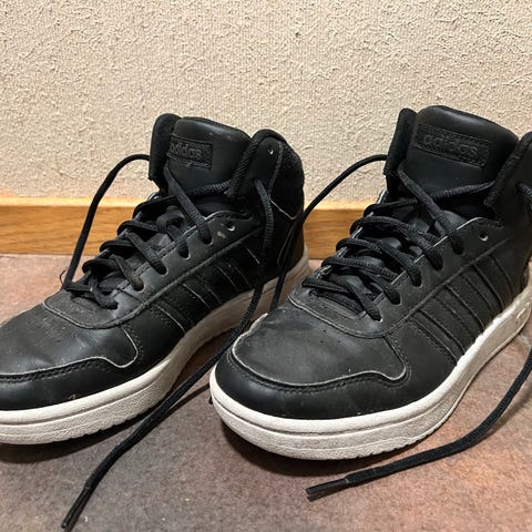 Adidas gutt / unisex sko i størrelse 38. Skoene har svart farge med hvite detaljer og gummisåle. Egnet for daglig bruk og ulike aktiviteter. Perfekt i som gymsko i hall.