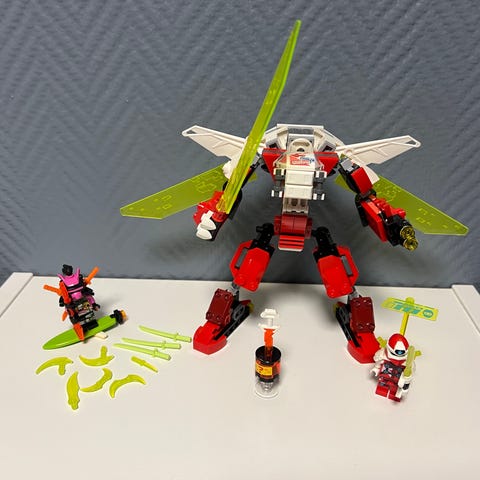 LEGO NINJAGO Golden Mech 71702 robotfigur med tilhørende minifigurer. Settet inneholder en stor robotfigur i hvitt og gull med bevegelige deler, samt flere minifigurer med tilbehør. Kan sendes mot at kjøper betaler frakt.