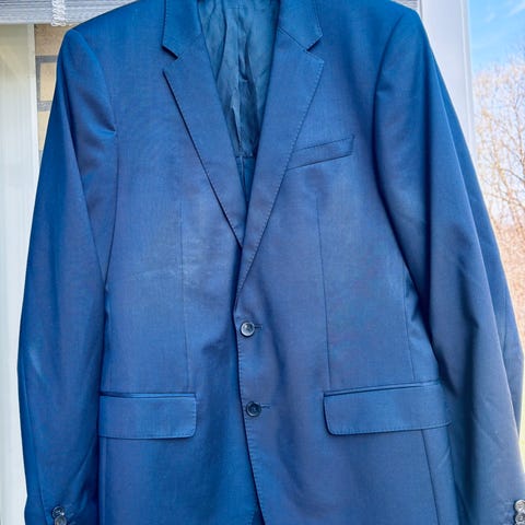 Massimo Dutti Blå Ull dressjakke for herre i størrelse M (Regular fit). Jakken er laget av ull og har en klassisk blå farge. Den har flere innerlommer og er foret med blått stoff. Produsert i Portugal.