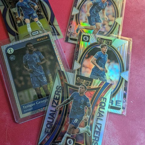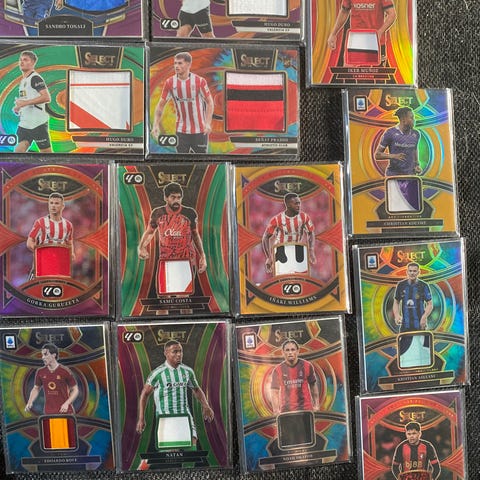 Selger 4 stk. fotballkort (samlet!) av den relativt dyre serien Panini Select Premier League 2024/2025. Dette er siste utgivelse enn så lenge, siden Panini har mistet lisensen til Topps. Alle kortene er satt i sleeve og Toploader for beskyttelse. Det du ser av riper etc. er utenpå toploader.
