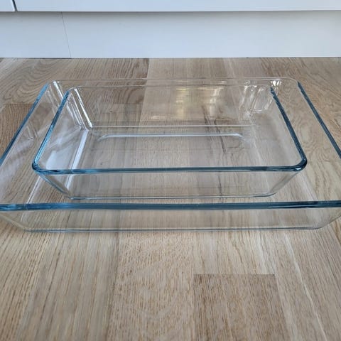 IKEA ildfast form to stk. Formene er laget av klart glass og kommer i to forskjellige størrelser. Egnet for matlaging og baking.