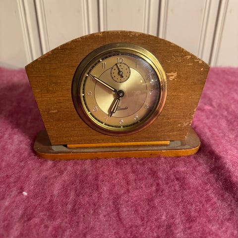 Vintage veggklokke laget i tre med dekorative utskjæringer og detaljer. Klokken har romertall på urskiven og en sentral dekorativ mekanisme. Passer til veggmontering og har et klassisk utseende.