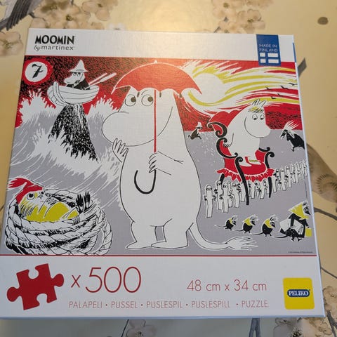 Puslespill med 99 biter og motiv fra Mummitrollet. Puslespillet har en størrelse på 48 x 34 cm.