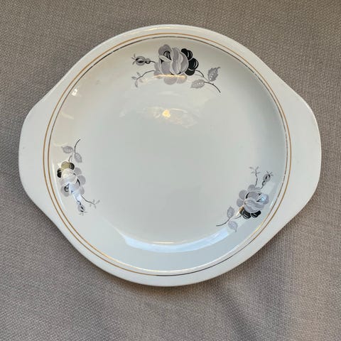 Fat fra Egersund Flint Norge. Diameter 28 cm. Gult med blomst på.