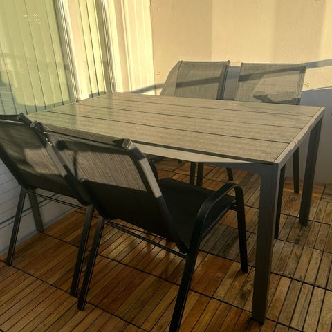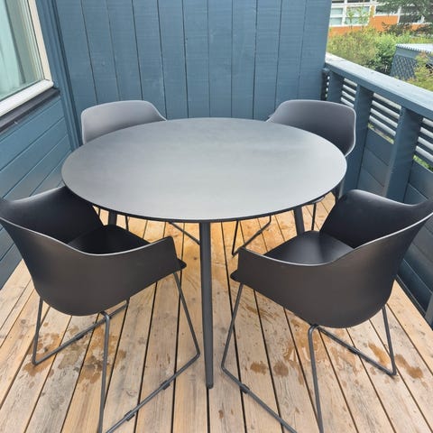 Hagebord i svart med tilhørende stoler med puter. Bordet har en rektangulær form og er laget for utendørs bruk. Stolene har armlener og puter for komfort. Settet er egnet for bruk på terrasse eller hage. Putene er hele og borrelås for feste fungerer som de skal. Liten skade på bordplate som er vanskelig å få fram på bilder.