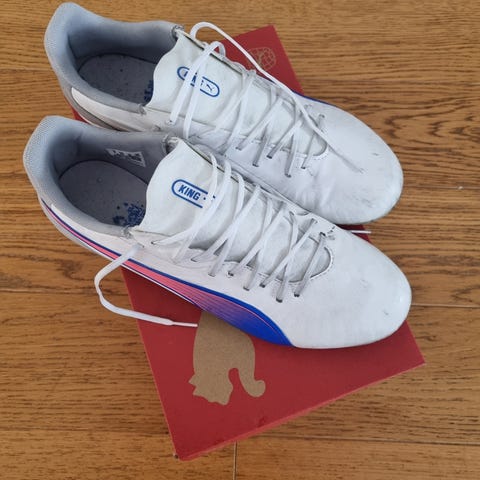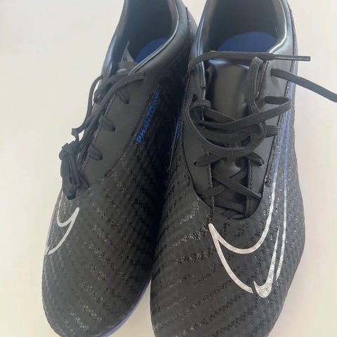 Nike Phantom fotballsko i størrelse 44. Skoene er blå og hvite og designet for fotballbruk. De har knotter, hvor noen er litt slitt derfor selges de billig