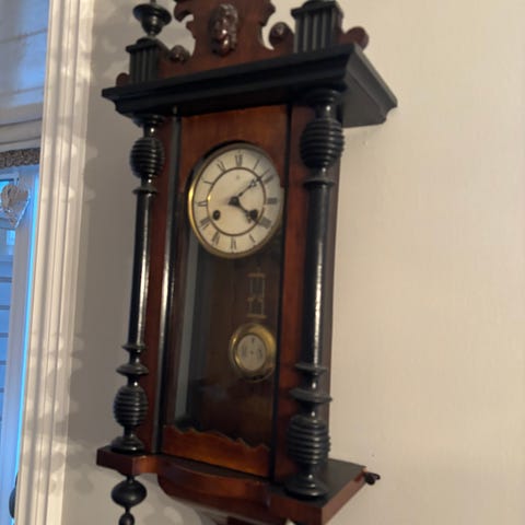 Bordur i tre med mekanisk urverk. Klokken har analog visning med time-, minutt- og sekundviser, samt en liten sekundviser på urskiven. Uret er montert i en buet trekonstruksjon med en flat fot for stabil plassering.