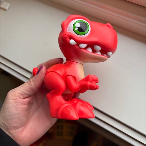 Rød liten Dinosaur lekefigur i plastmateriale. Figuren er liten i størrelse, omtrent 5 cm høy, og har rødfarge med detaljer i oransje og svart. Passer som leketøy for barn.