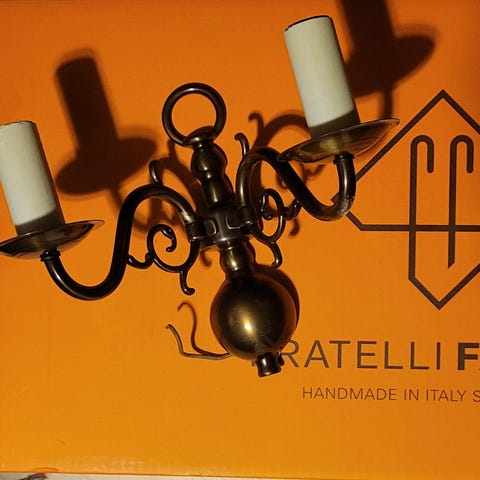 Lampett till ljus, vägglampa och bordslampa som även går att hänga på väggen. Gammal en och rost, säljs i befintligt skick.