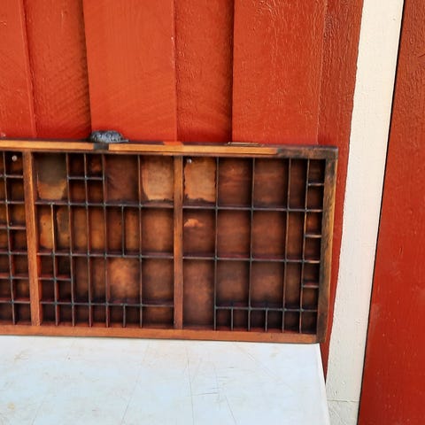 Fin, gammel settekasse. Brukt som skuffsortering i butikk eller trykkeri. Settekassen er i bra stand, med gamle bruksmerker og patina. Det er tydelig den har vært brukt i flere generasjoner.