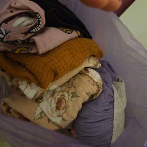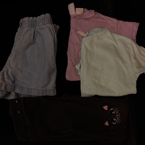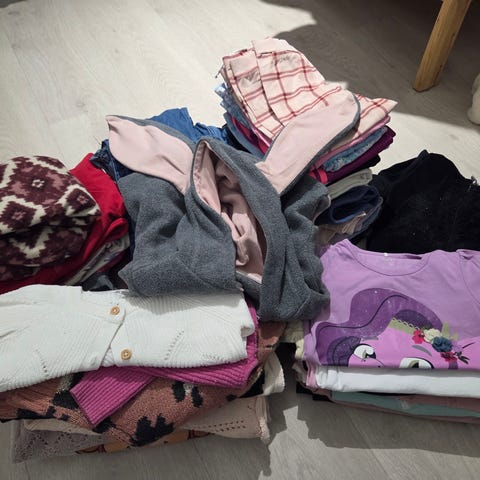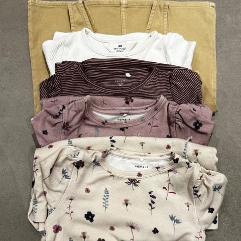 barneklær i størrelse 98 /104for jente. Flerfarget plagg med ulike mønstre og design. Inkluderer flere typer klær egnet for barn i denne aldersgruppen.