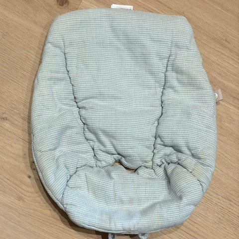 Babypute til Stokke Tripp trapp - puten som gir litt ekstra støtte i den perioden der ungen ikke sitter så godt selv men er for stor for et babysete. Smussavisende stoff som er lett å rengjøre når ungen insisterer på å spise selv og grøten uvergelig havner andre steder. Pent brukt - klar for nye sosiale og selvstendige barn