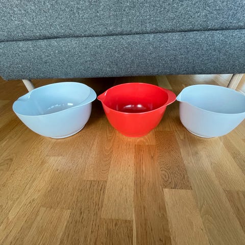 Selger 3 stk bakeboller i tre ulike str. Bakebollene har praktiske gummiknotter under som gjør at bakebollen står stabilt. De to største bakebollen har måleangivelse på innsiden.