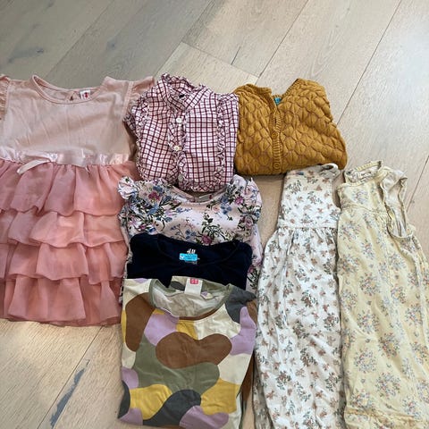 Div barneklær i størrelse 98/104 for jente. Inneholder ulike plagg i forskjellige farger og materialer, egnet for barn i denne aldersgruppen.