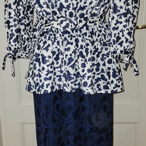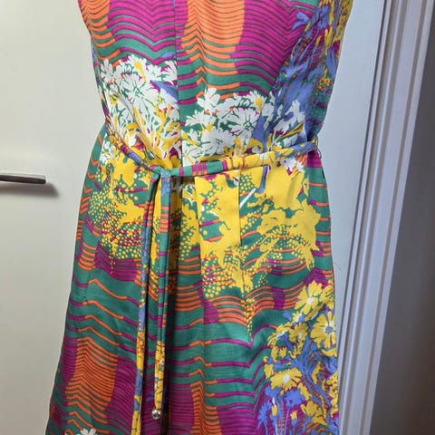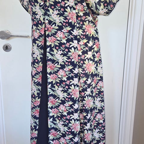 Meget pen ekte vintage-kjole. Ingen tag. Glidelås bak. Foret. Lekkert tykt stoff med gulltråd. Størrelse ca XL, men sjekk målene. Ikke elastisk. Lengde fra overkant skulder til skjørtekant ca 126 cm. Omkrets under armene ca 95 cm, liv ca 90 cm. Billigste porto. Se også mine øvrige annonser.