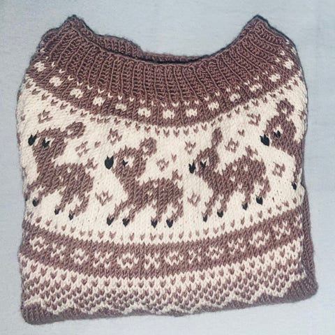 Ny hjemmestrikket Mariusgenser med rådyr/Bambi,1-2 år,100% tynn merinoull