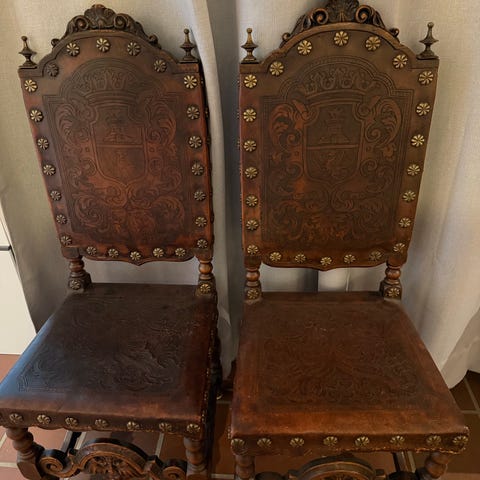 Antikke spisestuestoler i tre med utskjæringer