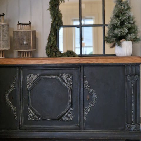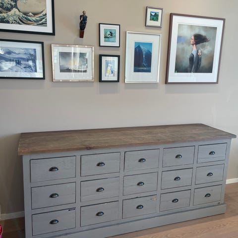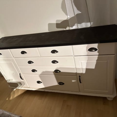 Usikker på merke, men den er 11 år gamle. Møbelet ser pent brukt ut, men har noe mindre slitasje. Det mest synlige er noen tørke sprekker fra 1. leveår. Selger gjerne samlet med andre spisestuemøbler vi har til salgs, se www.finn.no/446788620