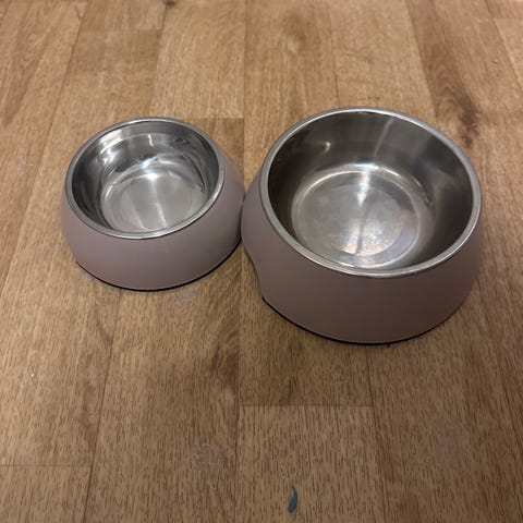 Selger to sett med matskåler, brukt til katt for kr. 100,- per stykk.