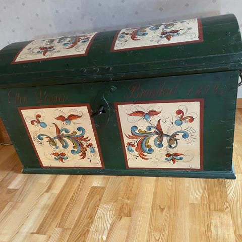 Antikk kiste med buet lokk, pent dekorert på front og lokk.