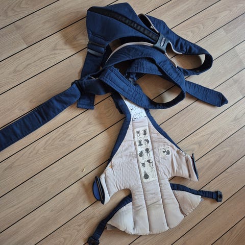 BabyBjörn bæresele i grå farge. Designet for å bære babyer på en ergonomisk måte med justerbare stropper for tilpasning. Laget av pustende materiale for komfort under bruk.