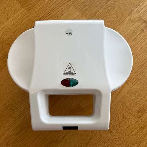 Wilfa vaffeljern elektrisk med justerbar temperaturkontroll og indikatorlys for strøm og varme. Enheten har et dekorativt mønster på vaffeljernet og et hvitt ytre. Passer til hjemmebruk for å lage vafler.