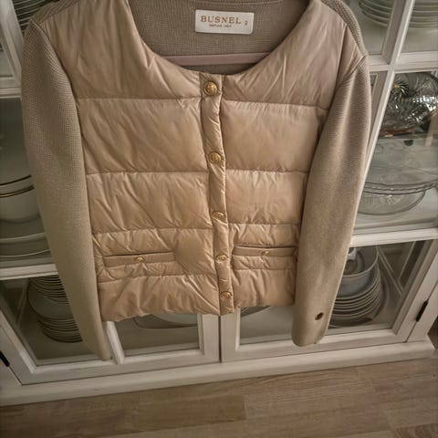 Busnel Andre jakker damejakke i størrelse M. Jakken er beige og laget av ull. Den har to lommer foran og en knappelukking. Jakken har en strukturert overflate og sorte detaljer langs kanter og lommer. Ny pris 3500