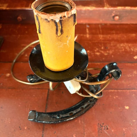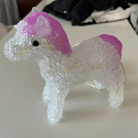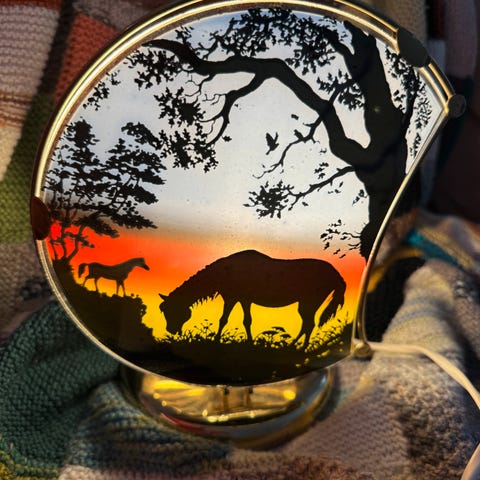 Hestelampe av lekehester som er limt og lakket. Skjerm med hestemotiv og blomster.
