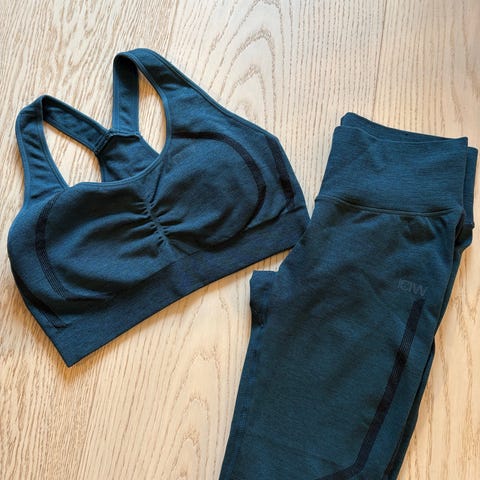 Sett bestående av treningsbukse, cropped genser og sports-BH, egnet for trening og annen aktivitet.