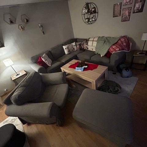 Hel og grei sofa selges rimelig. Hbo 500,- innen kort tid, ellers går den på skroten på fredag. 200cm*260cm*90cm. Kan med letthet bygges om h/v-v/h.