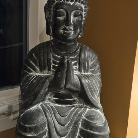 Fin Buddha-figur i mørk polyresin/stein. Høyde ca. 34 cm, bredde ca. 17 cm. Selges rimelig. Må hentes i Trondheim, kan ikke sendes.