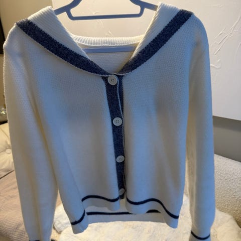 Mål: 55 cm over bringa, 45 cm lang arm, 56,5 cm lan fra skulder.