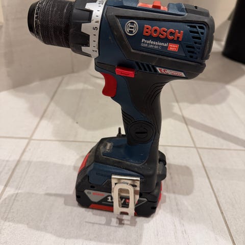 Bosch Professional GSR 18V-85 C drill med 18V batteri. Verktøyet er designet for tungt arbeid og har funksjoner som gjør det egnet for profesjonell bruk.