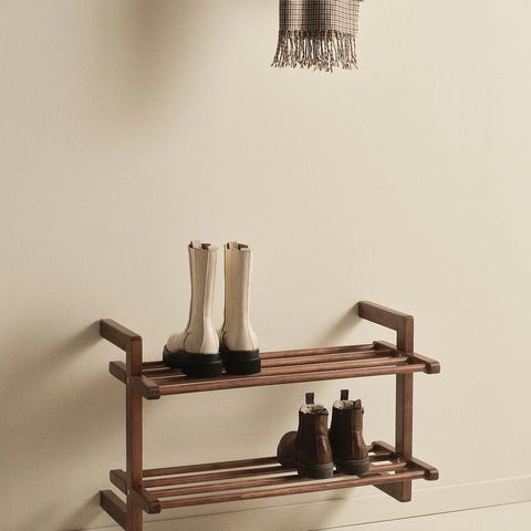 Fin, vegghengt skohylle selges. Skjulte veggfester bidrar til et stilrent design. Hyllen henger på to skruer i veggen, og er enkel å ta av og på ved behov.