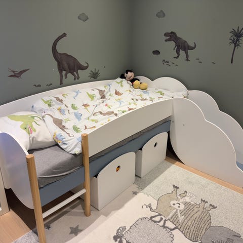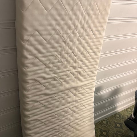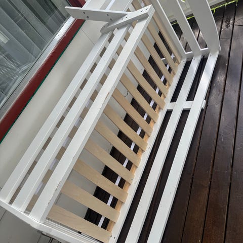 Vi har malt denne grå selv. Vi har også laget tak til den som kan følge med. Madrass følger også med.