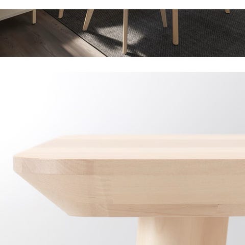 Liten fuktskade på hjørnet på det minste bordet, kun synlig i «riktig» belysning. Skjules når det lille bordet skyves delvis under det store bordet.